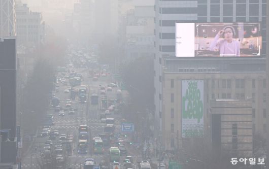17일 수도권의 미세먼지와 초미세먼지 농도가 나쁨 수준을 기록한 가운데 서울 종로구 세종대로 사거리에서 바라본 종로 일대가 미세먼지로 뿌옇게 보이고 있다. 국립환경과학원은 “대기가 정체하면서 국내 미세먼지가 빠져나가지 못하고 축적된 영향”이라고 설명했다.