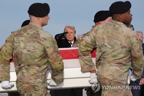 트럼프 대통령은 이날 오후 델라웨어주 도버 공군기지에서 열린 행사에 참석, 전사자들의 시신이 실린 관이 하나씩 공군 C-17 수송기에서 내려져 차량으로 운구될 때마다 거수경례로 애도를 표했다.