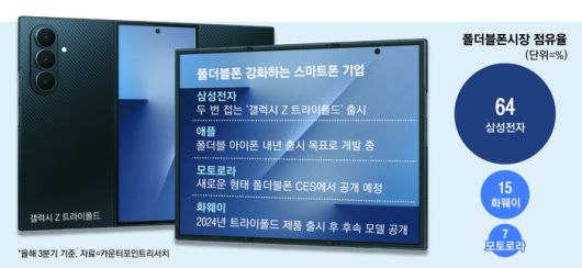 시장조사기관 카운터포인트리서치에 따르면 올해 3분기 글로벌 폴더블폰 출하량은 전년 동기 대비 14% 늘며 분기 기준 최고치를 기록했고, 전체 스마트폰 출고량 중 폴더블폰 비중은 2.5%까지 올라갔다. 같은 기간 폴더블폰 출하량 점유율은 삼성전자가 64%로 1위를 유지했고, 화웨이(15%)와 모토로라(7%)가 뒤를 이었다.