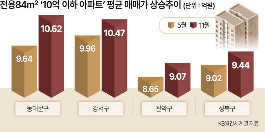 KB월간시계열 ‘㎡당 아파트 평균매매가격’에 따르면 지난 5월 84㎡를 기준으로 단순 계산했을 때, 평균 매매가가 10억원이 채 되지 않는 자치구는 강북구·노원구·도봉구·동대문구·성북구·은평구·중랑구·강서구·관악구·구로구·금천구 등 11개에 해당했다. 하지만 대출을 조이는 6·27 대출규제와 10·15 부동산 대책 시행 이후인 11월, 10억 미만 자치구는 9개로 줄었다.