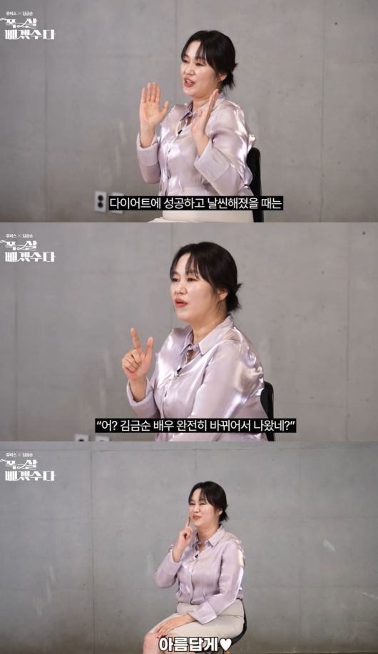 현재 갱년기와 체중 증가로 땀이나는 등 불편한 때가 많다는 김금순은 다이어트 성공을 떠올리며 "인생 2막이 시작되지 않을까. 김금순 배우 완전 바뀌어서 나왔네라고 관객들이 이야기할 수 있을 거 같다. 다양한 역할을 아름답게 할 수 있지 않을까"라는 기대를 표했다.