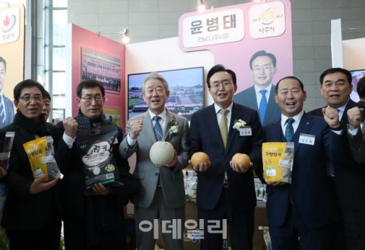[이데일리 김태형 기자] 강호동(왼쪽 세번째) 농협중앙회장이 18일 서울 중구 농협 본관에서 열린 ‘2025 농업발전혁신인像’ 시상식에서 윤병태 나주시장 등 관계자들과 나주시 홍보부스에서 기념촬영을 하고 있다.