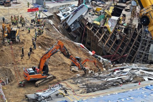 지난 4월 16일 경기 광명시 일직동 신안산선 복선전철 5-2공구 붕괴 현장에서 소방관 등 관계자들이 실종자 수색 작업을 이어가고 있다. 뉴스1 |