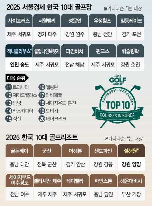 2025 한국 10대 골프장은 사이프러스·서원밸리·성문안·우정힐스·일동레이크·잭니클라우스·클럽나인브릿지·파인비치·핀크스·휘슬링락(이상 가나다순)이다.