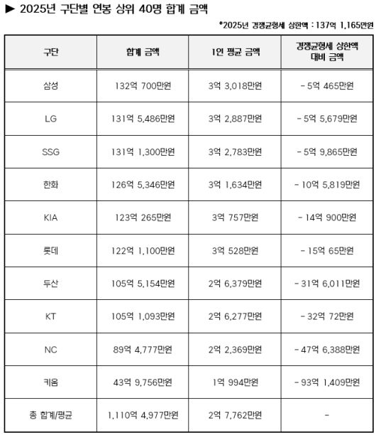 [스포츠서울 | 박연준 기자] KBO는 18일 2025년 구단별 연봉 상위 40명의 합계 금액을 발표했다.