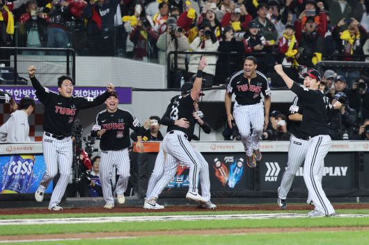 지난 10월 31일 KBO 코리안시리즈 5차전에서 우승한 LG 트윈스 선수들이 그라운드로 뛰쳐나오고 있다. [연합] |