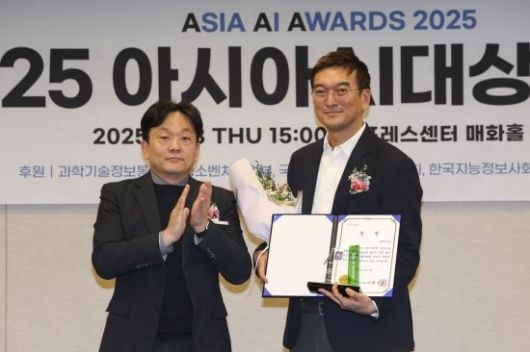 클라이원트가 18일 서울 중구 프레스센터 매화홀에서 열린 '제3회 아시아AI대상 시상식'에서 한국지능정보사회진흥원장상을 수상하고 있다. 2025.12.18 강진형 기자 |