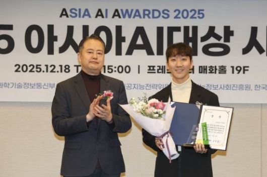 내이루리가 18일 서울 중구 프레스센터 매화홀에서 열린 '제3회 아시아AI대상 시상식'에서 벤처기업협회장상을 수상하고 있다. 2025.12.18 강진형 기자 |