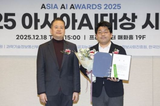 사각이 18일 서울 중구 프레스센터 매화홀에서 열린 '제3회 아시아AI대상 시상식'에서 벤처기업협회장상을 수상하고 있다. 2025.12.18 강진형 기자 |