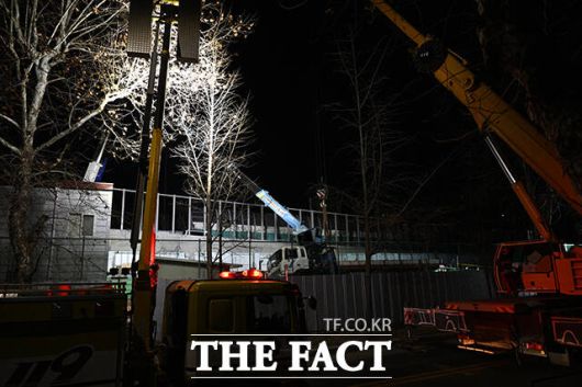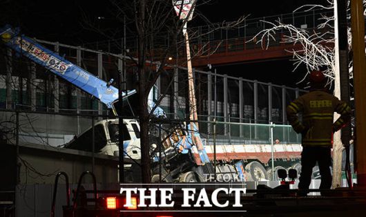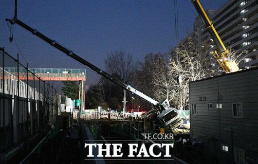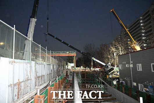 [더팩트ㅣ박헌우 기자] 18일 오후 서울 송파구 잠실대교 남단 나들목(IC) 연결체계 개선공사 현장에 크레인이 쓰러져 있다.