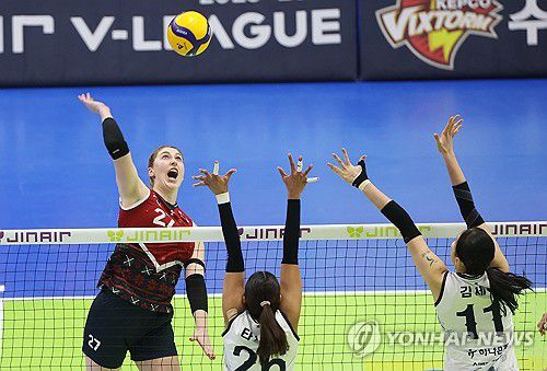 (수원=연합뉴스) 홍기원 기자 = 18일 경기도 수원실내체육관에서 열린 프로배구 V리그 여자부 현대건설 힐스테이트와 한국도로공사 하이패스의 경기. 현대건설 카리가 공격하고 있다. 2025.12.18