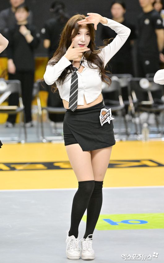 (엑스포츠뉴스 의정부, 김한준 기자) 18일 오후 경기도 의정부 경민대체육관에서 열린 '진에어 2025-2026 V-리그' KB손해보험과 삼성화재의 경기, 김현영 치어리더가 멋진 공연을 선보이고 있다.