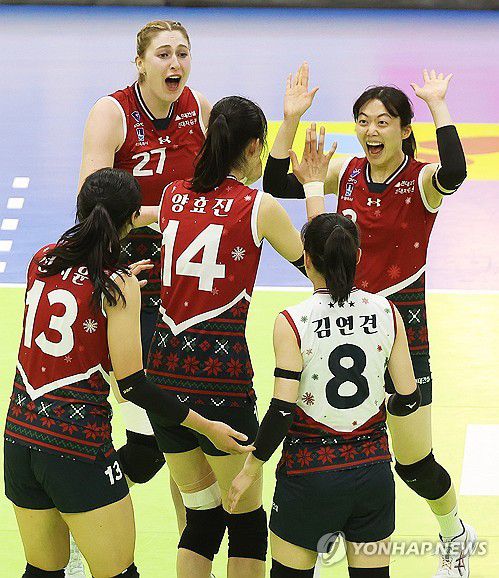 (수원=연합뉴스) 홍기원 기자 = 18일 경기도 수원실내체육관에서 열린 프로배구 V리그 여자부 현대건설 힐스테이트와 한국도로공사 하이패스의 경기. 세트스코어 3-1로 승리한 현대건설 선수들이 기뻐하고 있다. 2025.12.18