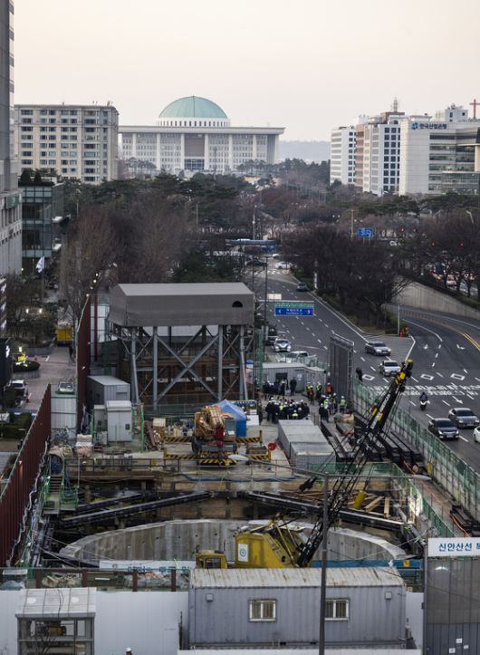 18일 서울 여의도역 인근 신안산선 공사 현장에서 철근이 무너지며 작업자를 덮쳐 50대 남성 1명이 숨지는 사고가 발생했다. 경찰은 시공사인 포스코이앤씨를 상대로 사고 원인 등을 조사 중이다. 사진은 이날 사고가 난 공사 현장 모습. [뉴시스]