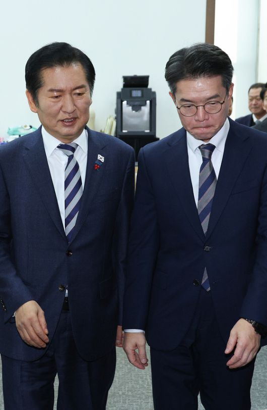 정청래 더불어민주당 대표(왼쪽)와 정원오 서울 성동구청장이 18일 비공개로 면담한 뒤 국회 당대표실을 나서고 있다. 정 구청장은 여권의 서울시장 후보군으로 꼽힌다. [뉴스1]▶ 중앙일보 / '페이스북' 친구추가▶ 넌 뉴스를 찾아봐? 난 뉴스가 찾아와! ⓒ중앙일보(https://www.joongang.co.kr), 무단 전재 및 재배포 금지