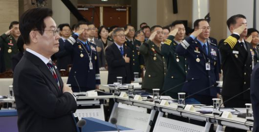 이재명 대통령이 18일 오후 서울 용산구 국방부 청사에서 열린 국방부·국가보훈부 업무보고에 참석해 국민의례를 하고 있다. 이날 국방부 업무보고에는 진영승 합동참모의장과 김규하 육군·강동길 해군·손석락 공군참모총장 등이 참석했다. [연합뉴스]