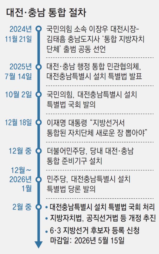 하지만 불편한 기류도 감지된다. 국민의힘 관계자는 “국회에서 단 한 차례 논의도 없었는데, 번갯불에 콩 구워 먹듯이 몇 달 안에 두 개의 광역자치단체를 통합하는 작업이 완성될 수 있겠느냐”고 말했다. 다른 관계자는 “여당 입장에선 대전·충남이 통합돼 야당이 ‘현역 프리미엄’ 없이 내년 지방선거를 치르게 되면 승산이 있다는 계산 아래 움직이는 것”이라고 말했다.