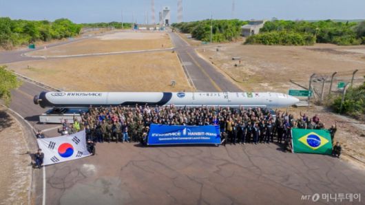 이노스페이스 스페이스워드(SPACEWARD) 발사 캠페인 현장인 브라질 알칸타라 우주센터에서 이노스페이스 임직원을 비롯해 브라질 공군이 기념 사진을 촬영하고 있다. |