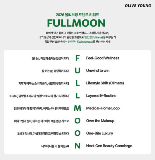 [디지털투데이 손슬기 기자] CJ올리브영은 올해와 내년 K뷰티·웰니스 산업을 관통하는 핵심 키워드로 'F.U.L.L.M.O.O.N'(보름달)을 선정하고 8가지 세부 트렌드를 담은 '2026 트렌드 키워드' 리포트를 발간했다고 19일 밝혔다.
