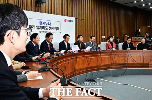 [더팩트ㅣ국회=배정한 기자] 송언석 국민의힘 원내대표(왼쪽 세번째)가 19일 오전 서울 여의도 국회에서 열린 원내대책회의에 참석해 모두발언을 하고 있다.