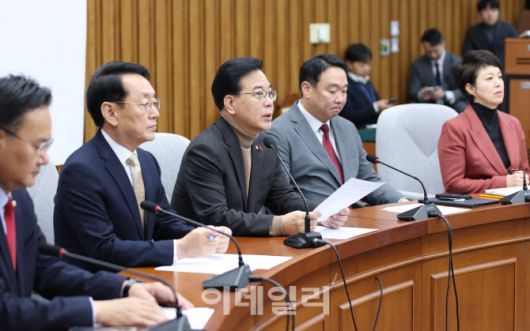 [이데일리 노진환 기자] 송언석 국민의힘 원내대표가 19일 서울 여의도 국회에서 열린 원내대책회의에서 모두발언을 하고 있다.