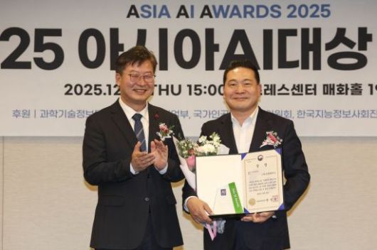 최은수 인텔리빅스 대표(오른쪽)가 18일 서울 중구 프레스센터 매화홀에서 열린 '제3회 아시아AI대상 시상식'에서 중소벤처기업부 장관상을 수상하고 있다. 2025.12.18 강진형 기자 |