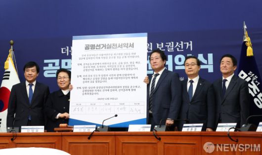 [서울=뉴스핌] 최지환 기자 = 이성윤(왼쪽부터), 문정복, 유동철, 이건태, 강득구 더불어민주당 최고위원 후보들이 19일 서울 여의도 국회에서 열린 공명선거 실천 서약식에서 서약서를 들고 기념촬영을 하고 있다. 2025.12.19 choipix16@newspim.com