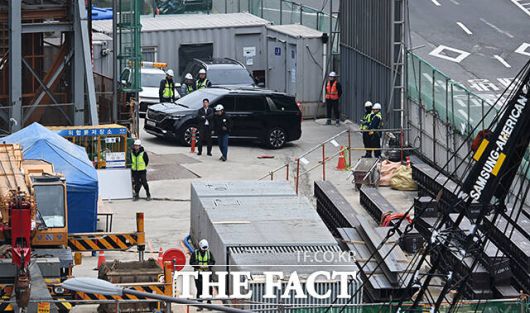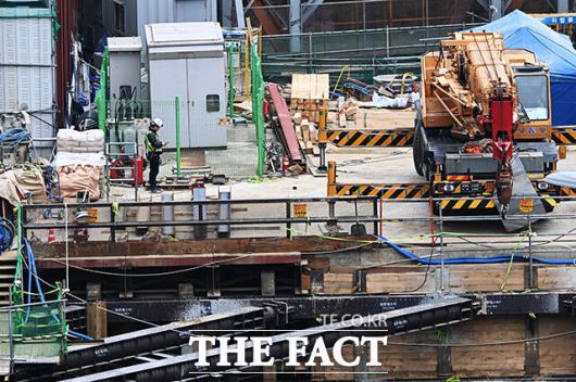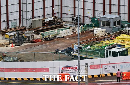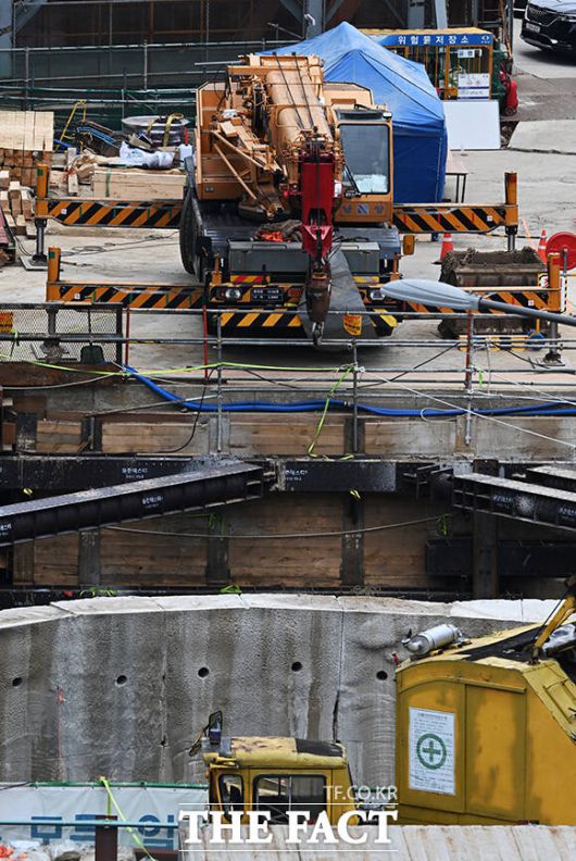 [더팩트ㅣ배정한 기자] 지난 18일 포스코이앤씨가 시공하는 서울 여의도역 신안산선 공사현장 지하 70m 지점에서 철근이 무너지는 사고가 발생한 가운데 19일 오전 관계자들이 현장을 관리하고 있다.