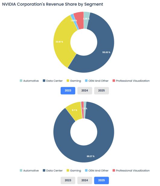 현재 기준으로 게임 부문은 엔비디아 전체 매출의 8%도 차지하지 못한다. 게임 매출 자체는 계속 늘고 있지만, 데이터센터 매출과 비교하면 미미한 수준이다. 비즈니스 인텔리전스 플랫폼 업체 불핀처(Bullfincher)는 이 비중이 얼마나 빠르게 변해왔는지도 짚었다. 불과 2년 전만 해도 게임은 엔비디아 전체 매출의 33% 이상을 차지했다.