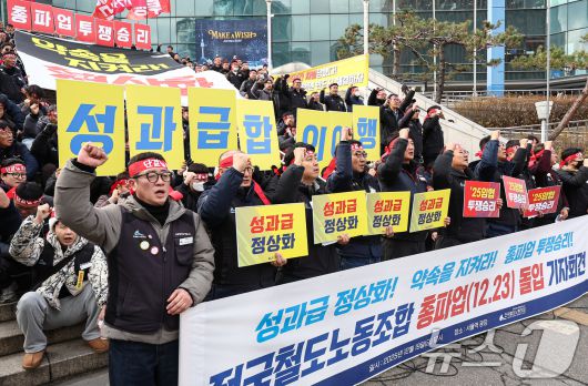 (서울=뉴스1) 김도우 기자 = 전국철도노동조합 조합원들이 19일 서울역 광장에서 열린 총파업 돌입 기자회견에서 구호를 외치고 있다. 철도노조는 정부가 성과급 정상화 약속을 이행하지 않고 있다며 오는 23일 오전 9시부터 총파업에 돌입한다고 밝혔다. 2025.12.19/뉴스1