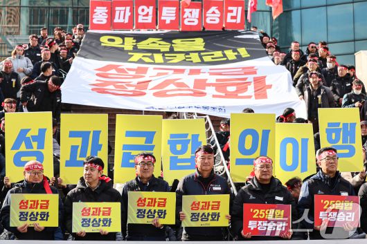 (서울=뉴스1) 김도우 기자 = 전국철도노동조합 조합원들이 19일 서울역 광장에서 총파업 돌입 기자회견을 하고 있다. 철도노조는 정부가 성과급 정상화 약속을 이행하지 않고 있다며 오는 23일 오전 9시부터 총파업에 돌입한다고 밝혔다. 2025.12.19/뉴스1