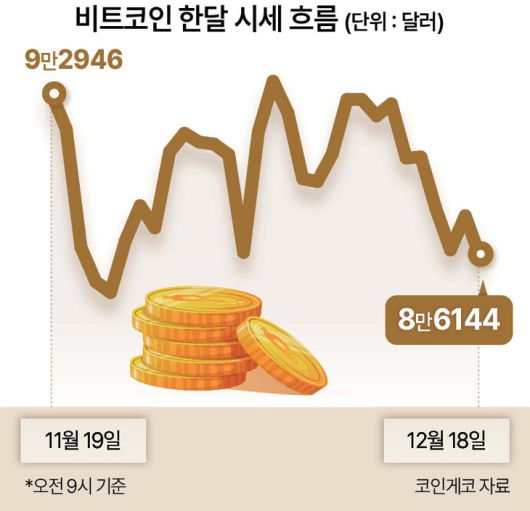 디지털자산 시장 약세장으로 전환하면서 4분기에만 시가총액이 2000조원 넘게 증발했다. 레버리지 포지션 청산과 대규모 옵션 만기, 일본 기준금리 인상 관측 등 불확실성이 겹치며 시장 전반의 경계심리가 높아지는 모습이다. 연말을 앞두고도 부정적인 전망이 잇따르고 있어 디지털자산의 위기감이 커지고 있다.