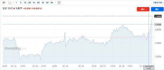 19일 교도통신과 니혼게이자이신문(닛케이)에 따르면 일본 10년물 국채 금리는 이날 채권시장에서 한때 2.005%까지 상승했다. 일본 10년물 국채 금리가 2%선을 넘어선 것은 2006년 5월 이후 처음이다. 10년물 국채 금리는 지난 17일 1.98%까지 오른 데 이어 상승 흐름을 이어갔다.