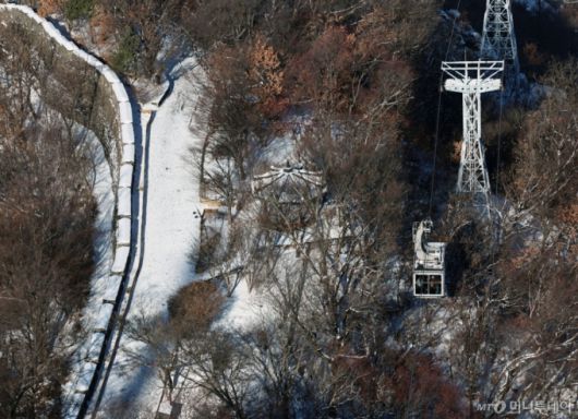 (서울=뉴스1) 구윤성 기자 = 5일 오전 서울 남산 케이블카가 눈 쌓인 산등성이를 지나고 있다. 2025.12.5/뉴스1 Copyright (C) 뉴스1. All rights reserved. 무단 전재 및 재배포, AI학습 이용 금지. /사진=(서울=뉴스1) 구윤성 기자