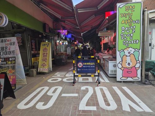 (부천=연합뉴스) 황정환 기자 = 트럭이 돌진해 22명의 사상자가 발생한 경기 부천 제일시장에서 영업시간 동안 차량 운행이 통제된다.