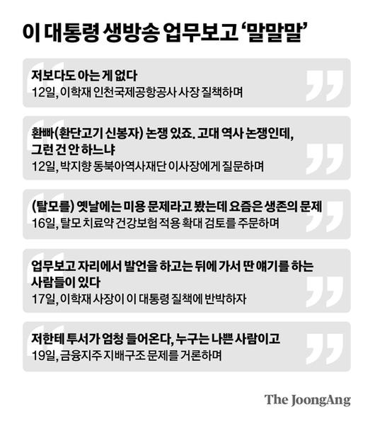 반면 이 대통령의 즉흥 발언이 생중계되면서 논란만 키운다는 부정적 평가도 적지 않다. 작은 이슈가 논란이 되면서 ‘꼬리가 몸통을 흔든다’는 것이다. 예컨대 이 대통령의 이학재 인천국제공항공사 사장을 향한 질책에서 시작된 둘의 갈등 이슈는 업무보고 그 자체보다 더 관심을 받았다. 김만흠 전 국회 입법조사처장은 “생중계 업무보고가 국민에게 이슈를 직접 전달하겠다는 취지인데, 정작 국민에게 무엇이 전달됐을까”라고 물으며 “탈모 관련 논란 등만 기억에 남고, 정작 중요한 이슈는 사라졌지 않느냐”고 했다.