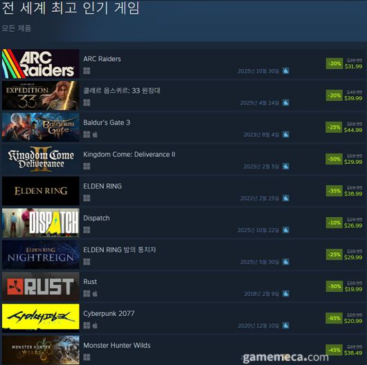 유저들에게 호평받았던 디스패치는 10% 할인으로 6위에 자리했다. 출시 전 사전 구매 당시 가격 수준이나 게임성을 인정받았으므로 적은 할인 폭에도 관심이 높아진 것으로 보인다. 여기에 올해 주요 시상식을 휩쓸고 있는 클레르 옵스퀴르: 33 원정대는 12월 초 시작했던 20% 할인을 2주째 유지하며 아크 레이더스에 이어 2위를 차지하고 있다.