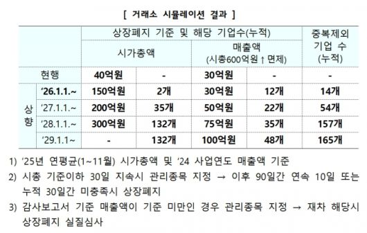 시가총액 상장폐지 요건도 1월부터 확대된다. 시총이 현 40억원에서 단계적으로 150억원 미만이면 상폐 요건에 해당하게 된다. 시뮬레이션 결과 내년 14개사가 상장폐지 요건에 해당하지만 기준 상향조정이 마무리되는 2029년은 코스닥 상장기업의 9.5%인 165개가 상폐 요건에 해당하게 된다.