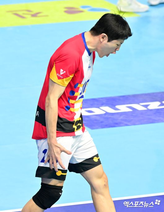 (엑스포츠뉴스 인천, 김한준 기자) 19일 오후 인천 계양체육관에서 열린 '진에어 2025-2026 V-리그' 대한항공과 한국전력의 경기, 대한항공 정지석이 블로킹 성공 후 포효하고 있다.김한준 기자 kowel@xportsnews.com