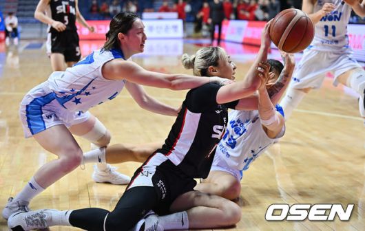 부산 BNK 김소니아가 아산 우리은행 세키 나나미, 변하정의 마크를 피해 패스하고 있다. 2025.12.19 / foto0307@osen.co.kr