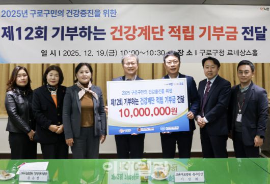 [이데일리 김태형 기자] 장인홍(가운데) 구로구청장이 19일 구로구청 르네상스홀에서 ‘제12회 걸으며 기부하는 건강계단 적립금 기부 행사’에서 적립 기부금 전달행사를 하고 있다.