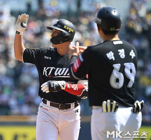 2024년 10월 9일 오후 경기도 수원KT위즈파크에서 ‘2024 KBO리그 포스트시즌’ LG 트윈스와 KT 위즈의 준플레이오프 4차전 경기가 열렸다. 4회말 1사 2루에서 KT 황재균이 1타점 적시타를 치고 2루에 진루한 후 기뻐하고 있다. 사진=김영구 기자