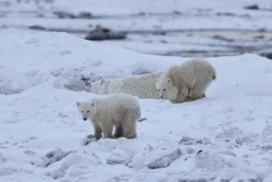 연구진은 이들을 모습을 촬영했는데, 영상에는 새끼 곰 두 마리가 눈밭을 뛰노는 모습과 그 뒤에 서 있는 어미 곰의 모습 등이 담겼다.