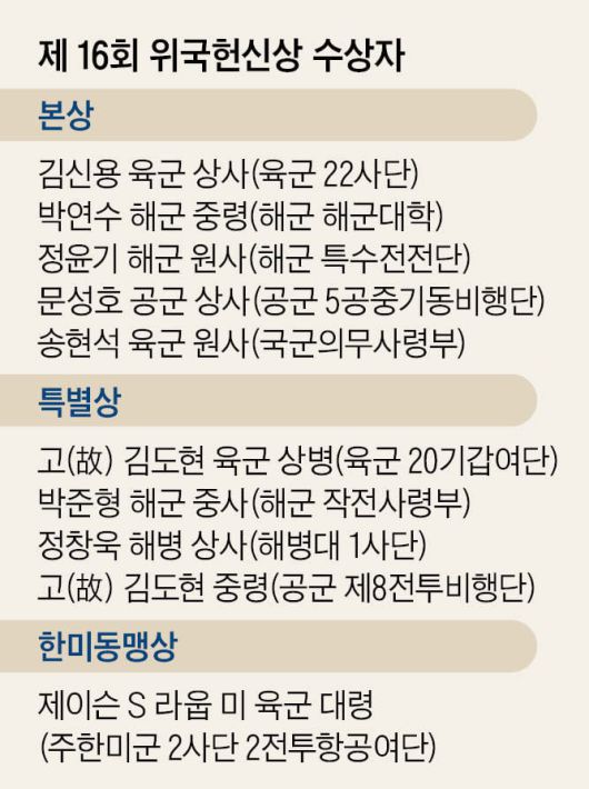 국방부와 조선일보가 공동으로 제정한 위국헌신상 제16회 시상식이 19일 서울 용산구 국방컨벤션에서 열렸다. 천안함 피격 사건 당시 작전관으로 근무했고, 부활한 천안함의 함장을 맡았던 박연수 해군 중령 등 5명이 본상을 받았다. 특별상은 2024년 훈련 중 순직한 고(故) 김도현 육군 상병 등 4명에게 돌아갔다. 한미동맹상 수상자로는 주한미군 2사단 2전투항공여단장 제이슨 S 라웁 미 육군 대령이 선정됐다.