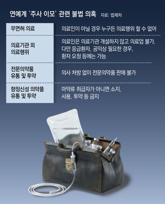 연예계 ‘주사 이모’ 논란이 일파만파 번지고 있다. 주사 이모는 병원이 아닌 공간에서 수액, 진통제, 항생제 등 의약품을 불법적으로 주사하는 이들을 말한다. 개그우먼 박나래 씨에 이어 아이돌 그룹 멤버, 유명 유튜버까지 불법 방문 진료를 받은 사실을 인정하고 방송 활동을 중단했다. 무면허 의료 행위뿐만 아니라 의사가 처방하지 않으면 쓸 수 없는 향정신성의약품을 제공받았다는 의혹도 제기됐다. 간단한 영양 수액주사도 의사의 처방을 받지 않고 맞을 경우 감염, 쇼크, 장기 부담 등 부작용이 생길 수 있다.》