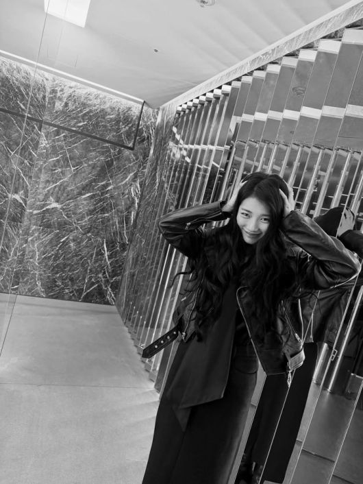 공개된 사진 속 수지는 올블랙 스타일링에 가죽 재킷을 걸친 채 특유의 고혹적인 분위기를 자아냈다. 긴 웨이브 헤어와 자연스러운 미소, 그리고 카메라를 응시하는 여유로운 눈빛이 조화를 이루며 우아한 무드를 더했다.