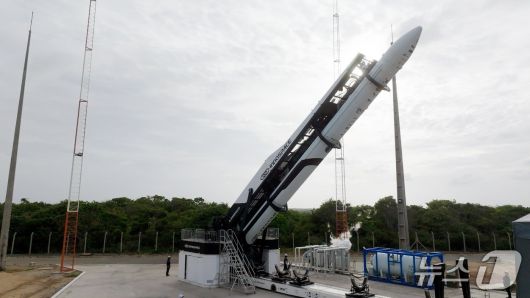 한국시간 20일 오전 4시 35분 브라질 알칸타라 우주센터서 첫 상업 발사 준비를 앞두고 있는 이노스페이스의 로켓 '한빛-나노'가 기립하는 모습.(이노스페이스 제공)/뉴스1