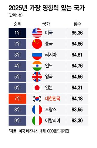 매체는 △정치적 안정성 △경제적 영향력 △국방 예산 △무기 체계 △글로벌 동맹 △문화적 영향력 △군사력 등 7개 항목을 종합 평가했다. 한국은 94.18점을 받아 7위에 올랐다.