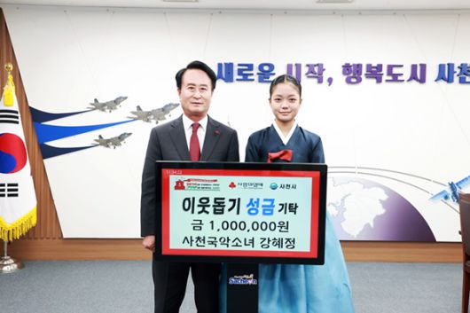 (사천=국제뉴스) 정천권기자 = 사천의 소리꾼이자 국악소녀 강혜정양이 지난 15일 사천시청을 방문해 관내 어려운 이웃을 위한 성금 100만원을 기탁했다.