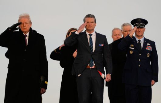 도널드 트럼프(왼쪽) 미국 대통령이 17일(현지 시간) 델라웨어주 도버 공군기지에서 열린 미군 병사 유해 귀환식에 참석해 피트 헤그세스 국방장관, 댄 케인 합참의장 등과 함께 운구되는 관을 향해 거수경례하고 있다. 뉴시스 |
